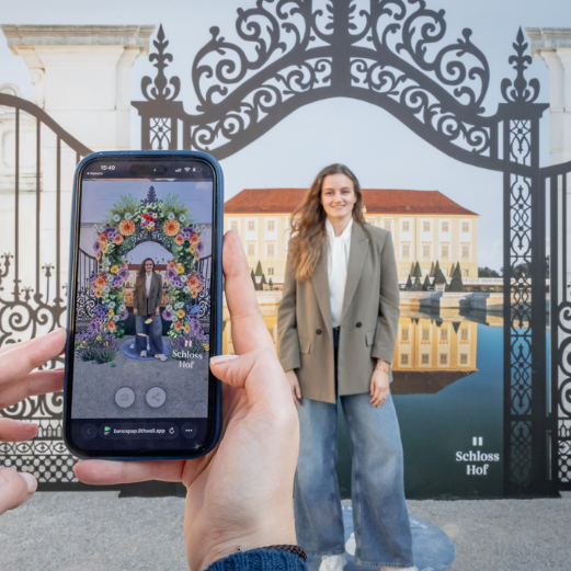 V pokladničnom dvore zámku Schloss Hof môžete pri špeciálnej fotostene s rozšírenou realitou oživiť kvety, motýle a hrdého páva priamo vo svojom smartfóne.