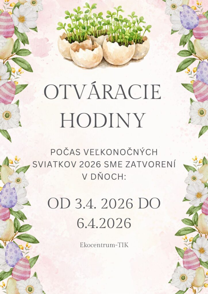 dovoľujeme si Vás informovať, že počas veľkonočných sviatkov budú Ekocentrum aj Turistická informačná kancelária zatvorené v dňoch od 3. apríla 2026 do 6. apríla 2026. Opäť sa na Vás tešíme v utorok 7. apríla 2026.