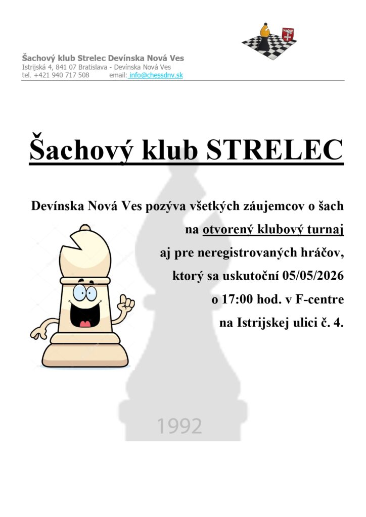 Šachový klub Strelec Devínska Nová Ves pozýva všetkých záujemcov o šach na otvorený klubový turnaj aj pre neregistrovaných hráčov.